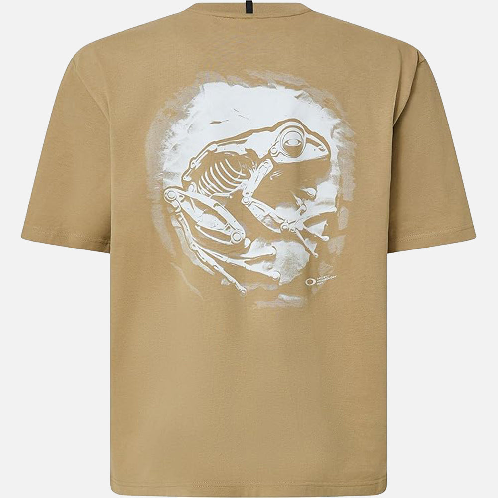 This 100% cotton peached men’s t-shirt will catch the eye for its large fossil frog graphic on the back. Sporting a comfortable, boxy fit, it also features an understated embroidered Oakley Ellipse logo on the chest and the hallmark back leash holder.