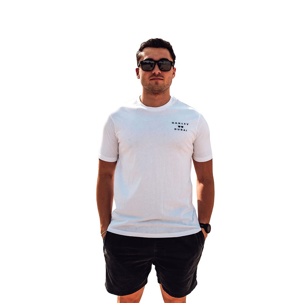 The Oakley Sun Short Sleeve Dubai Destination Tee is Made with Moisture-Wicking Fabric to Keep you Dry and Comfortable. This Classic-Fit Tee Displays the Oakley Name and Ellipse Logo for Modern Athletic Style.